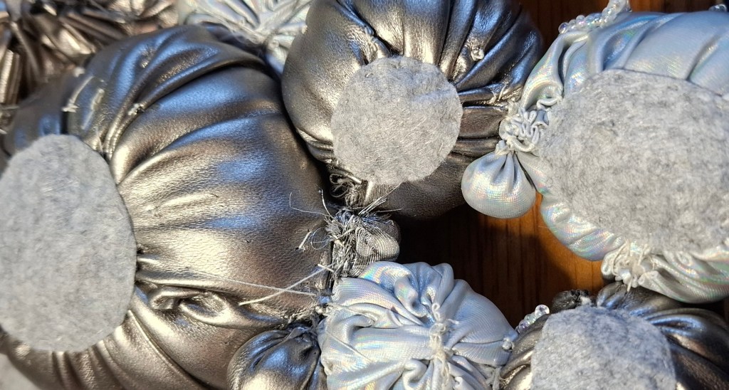 With such firm stuffing, sewing it together was both finicky and required a bit of muscle power at times. In this next image I’ve covered over some of the gathering points and stitching over with fine, soft grey felt, which tidies it up a bit. And though I never mind showing ‘the artist’s hand’, covering those more extreme textured areas in my opinion elevates the level of craftsmanship a little – and good craftsmanship never goes out of style IMHO. It’s signed in tiny permanent ink letters on the back of one of the metallic puffs.